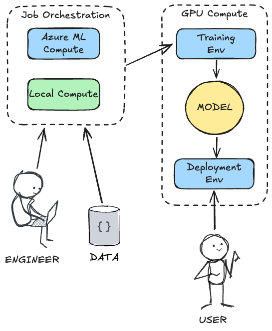 The real value proposition of running this on Azure ML is the separation of concerns: as an engineer, you can orchestrate the entire process from your local machine (or a lightweight cloud VM or even a tablet!), while offloading the heavy lifting to powerful, on-demand GPU clusters. Azure ML handles the provisioning of the training environment, the execution of the training job, the storage of the resulting model, the collaboration of multiple users, and finally, the deployment to a managed environment where users can interact with it.
